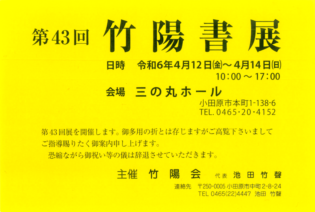 第43回 竹陽書展 2024年4月12日(金)〜 14日(日)第43回 竹陽書展 2024年4月15日 書展・展覧会(開催済) 本会支部の展覧会の記録です。 第43回 竹陽書展会期:2024年4月12日(金)〜 14日(日)会場:小田原三の丸ホール Instagram 10 likes, 1 comments - shoshin_shodo on April 12, 2024: "【開催中!】第43回竹陽書展 2024年4月1… www.instagram.com