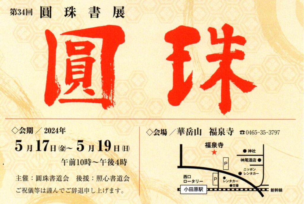第34回 圓珠書展 2024年5月17日(金)〜19日(日) 第34回 圓珠書展 2024年5月25日 書展・展覧会(開催済) 本会支部の展覧会の記録です。 第34回 圓珠書展会期:2024年5月17日(金)〜19日(日)会場:福泉寺(小田原市)
