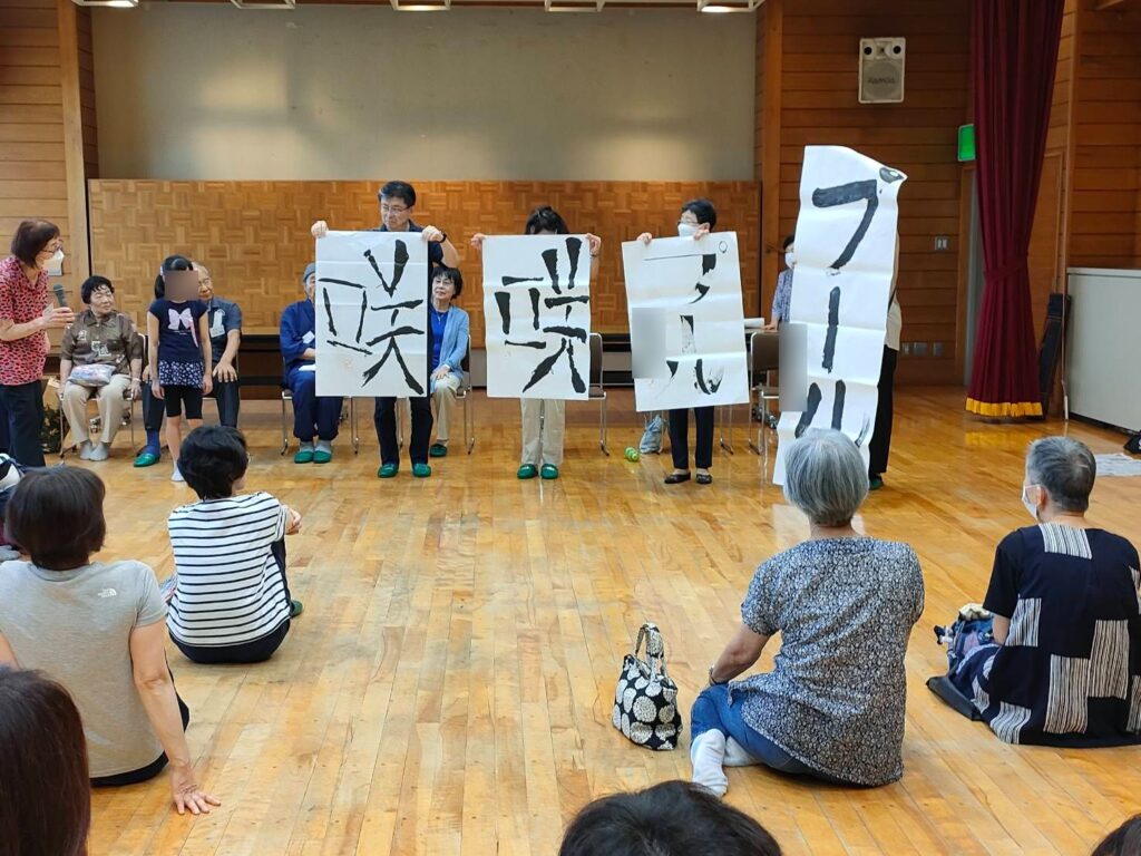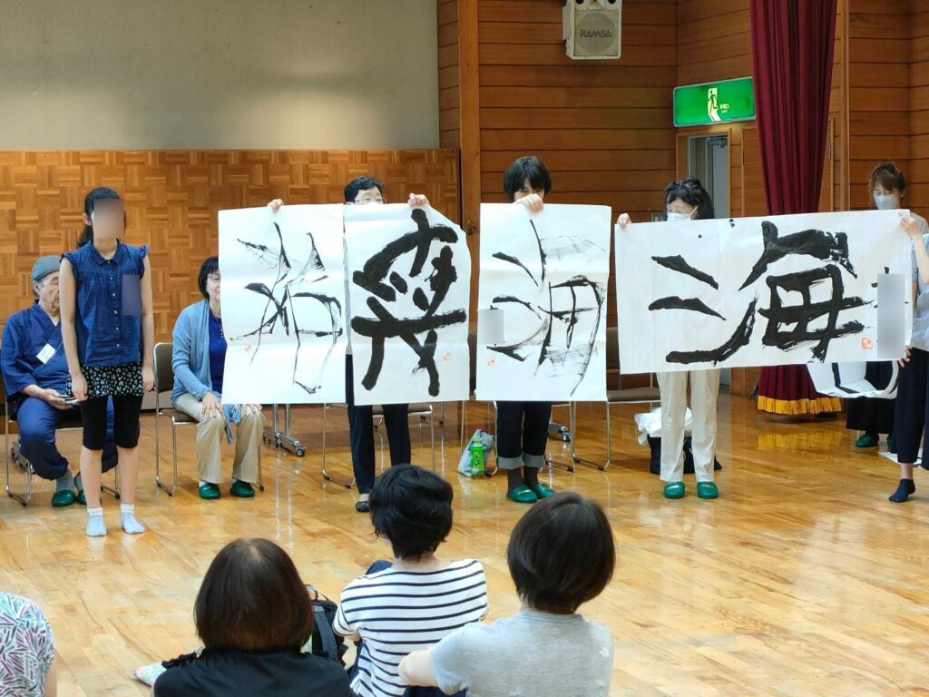 「楽しい書道」は、普段の課題とは異なる大きな紙に、学校で習う書き方にとらわれない自由な作風で書き上げました。